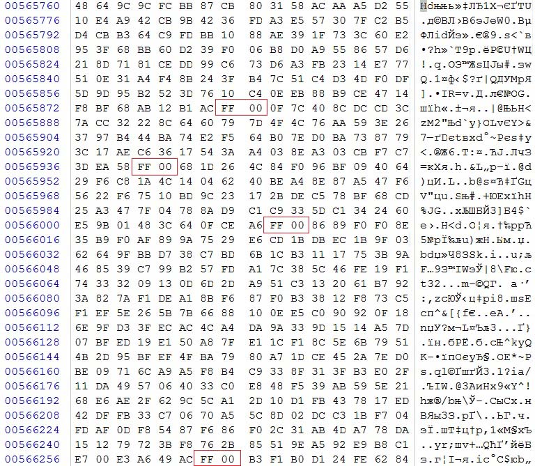 Эти фрагменты можно идентифицировать как собственно закодированные с помощью алгоритма JPEG (алгоритма кодирования Хаффмана и дискретного косинусного преобразования) цифровые данные, идущие после маркера SOS (Start of Scan) 0xFFDA и являющиеся основной частью JPEG-файла.
